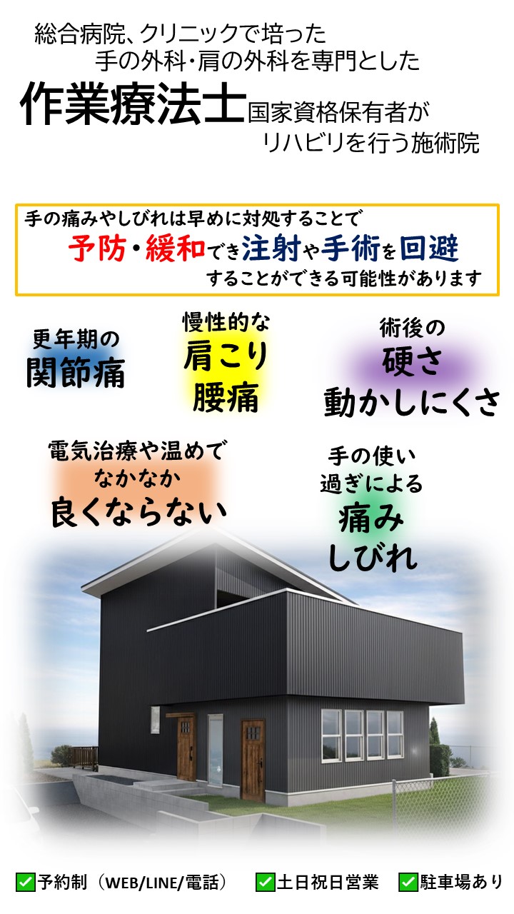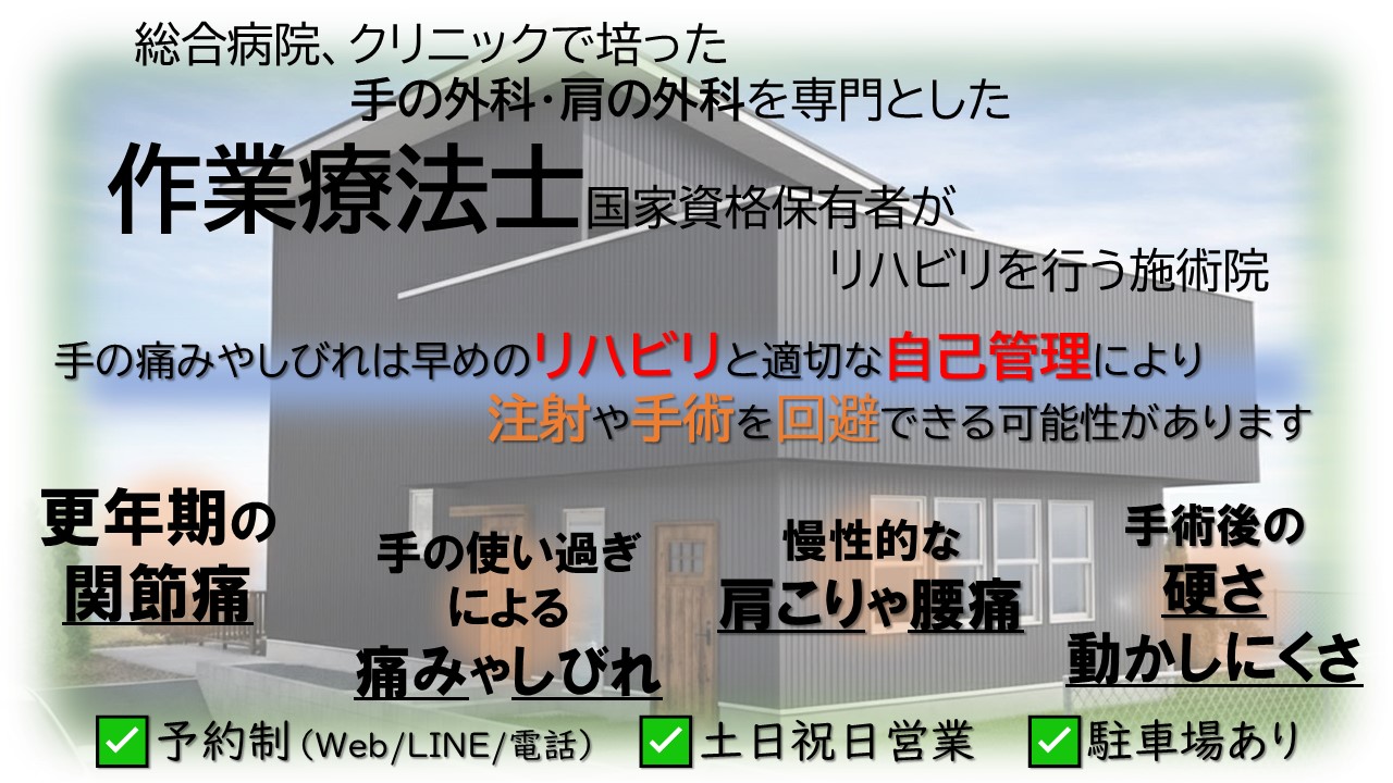 肩・肘・手指専門リハビリ施術院でございます。